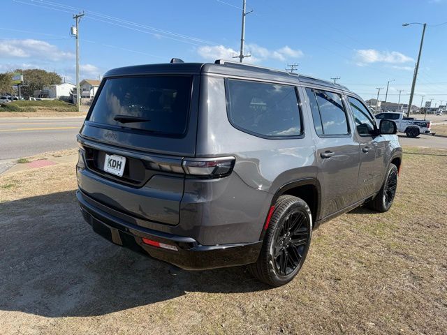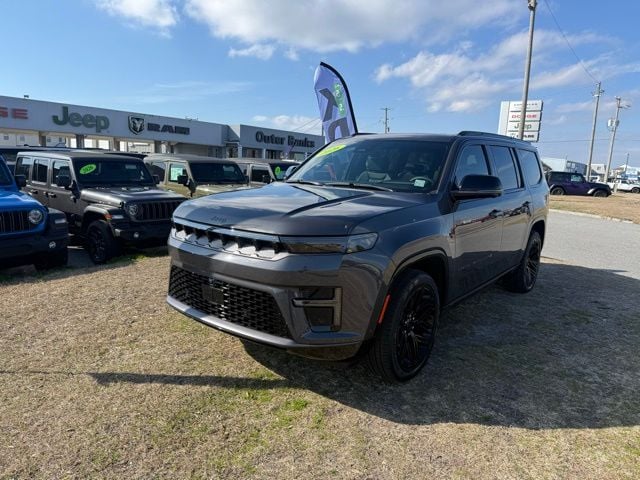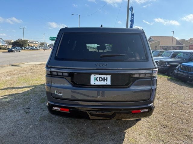 Equipped with ABS brakes, Active Cruise Control, Alloy wheels, Compass, Electronic Stability Control, Front dual zone A/C, Heated door mirrors, Heated Exterior Mirrors, Heated front seats, Heated rear seats, Illuminated entry, Low tire pressure warning, Navigation System, Power Liftgate, Remote keyless entry, Traction control, 118 Mph Maximum Speed Calibration, 3.55 Rear Axle Ratio, 3rd row seats: bench, 4-Wheel Disc Brakes, 9 Speakers, Air Conditioning, AM/FM radio: SiriusXM with 360L, Anti-whiplash front head restraints, Apple CarPlay/Android Auto, Audio memory, Auto Adjust in Reverse Exterior Mirrors, Auto High-beam Headlights, Auto-dimming door mirrors, Auto-Dimming Exterior Driver Mirror, Auto-dimming Rear-View mirror, Auto-leveling suspension, Automatic temperature control, Brake assist, Bumpers: body-color, Delay-off headlights, Driver door bin, Driver vanity mirror, Driver's Seat Mounted Armrest, Dual front impact airbags, Dual front side impact airbags, Emergency communication system: Jeep Connect, Exterior Mirrors Approach Lamps, Exterior Mirrors with Memory, Exterior Mirrors with Supplemental Signals, Exterior Parking Camera Rear, Four wheel independent suspension, Front anti-roll bar, Front Bucket Seats, Front Center Armrest w/Storage, Front fog lights, Front reading lights, Fully automatic headlights, Garage door transmitter, Heated steering wheel, Knee airbag, Leather Trimmed Bucket Seats, Memory seat, Normal Duty Suspension, Occupant sensing airbag, Outside temperature display, Overhead airbag, Overhead console, Panic alarm, Passenger door bin, Passenger seat mounted armrest, Passenger vanity mirror, Power door mirrors, Power driver seat, Power passenger seat, Power steering, Power windows, Radio data system, Radio: Uconnect 5 Nav with 12.0" Display, Rain sensing wipers, Rear air conditioning, Rear anti-roll bar, Rear reading lights, Rear seat center armrest, Rear window defroster, Rear window wiper, Reclining 3rd row seat, Security system, Speed control, Speed-sensing steering, Speed-Sensitive Wipers, Split folding rear seat, Steering wheel memory, Steering wheel mounted audio controls, Tachometer, Telescoping steering wheel, Tilt steering wheel, Trip computer, Turn signal indicator mirrors, Variably intermittent wipers, Ventilated front seats, Ventilated rear seats, Voltmeter, and Wheels: 22" x 9" Painted Gloss Black.