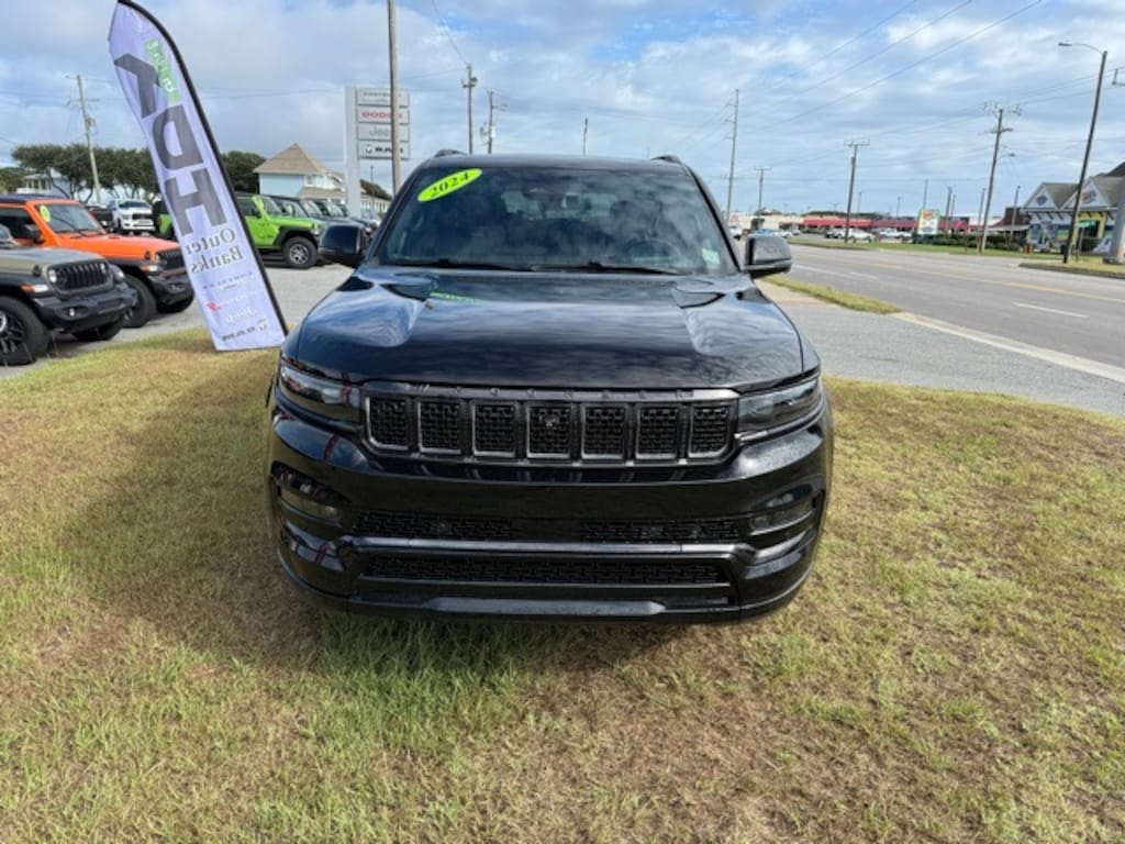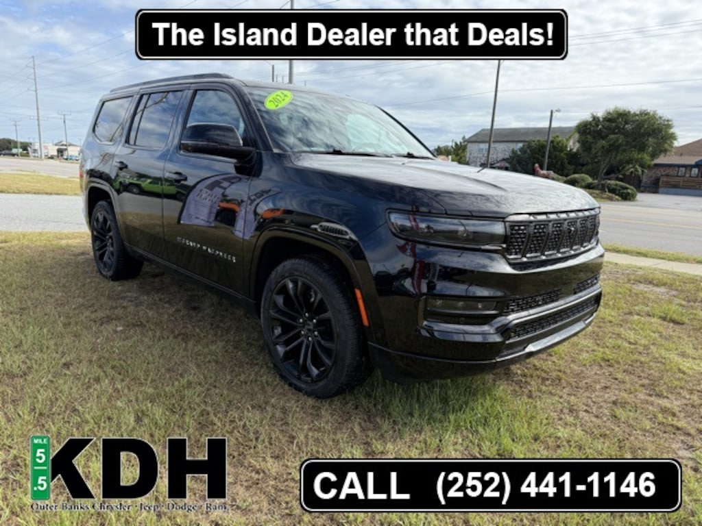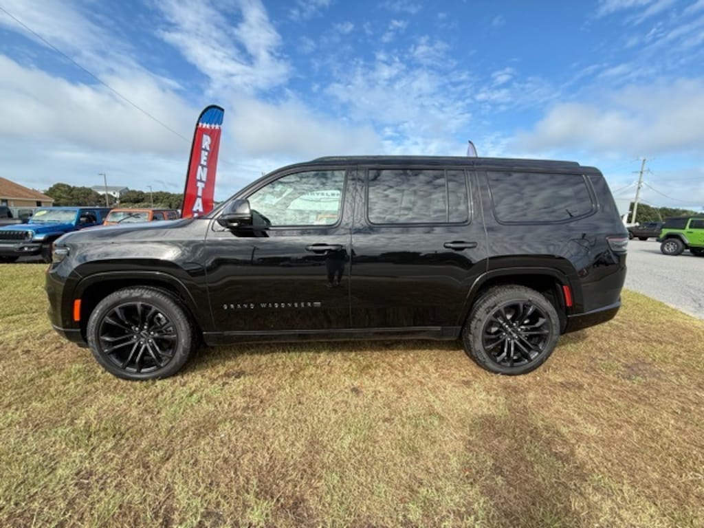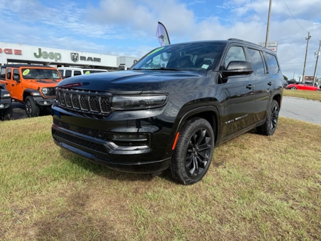 Equipped with Convenience Group III (Active Driving Assist System, Advanced Security Alert System, Interior Rear Facing Camera, Intersection Collision Assist System, Night Vision/Pedestrian-Animal Detection, and Rearview Autodim Digital Display Mirror), Obsidian Appearance Package, Quick Order Package 28T Obsidian (23 Speaker McIntosh Reference Audio System, Adjustable Roof Rail Crossbars, Black Roof, Cargo Cover, Front Passenger Interactive Display, Gloss Black Upper & Lower DLO Molding, Piano Black Exterior Accents, Premium Tinted Glass, Ventilated Rear Seats, and Wheels: 22" x 9.0" Tinted Polished w/Black Insert), Rear Seat Video Group 1 (Amazon Fire TV Built-In, Seatback Video Screens, and Video USB Port), MOPAR Interior Protection Package (All-Season Floor Mats and Cargo Tray), Two Tone Paint Group, 19 Speakers, 3.92 Rear Axle Ratio, 3rd row seats: bench, 4-Wheel Disc Brakes, ABS brakes, Adjustable pedals, Air Conditioning, Alloy wheels, AM/FM radio: SiriusXM with 360L, Anti-whiplash front head restraints, Apple CarPlay/Android Auto, Audio memory, Auto High-beam Headlights, Auto-dimming door mirrors, Auto-dimming Rear-View mirror, Auto-leveling suspension, Automatic temperature control, Brake assist, Bumpers: body-color, Compass, Delay-off headlights, Driver door bin, Driver vanity mirror, Driver's Seat Mounted Armrest, Dual front impact airbags, Dual front side impact airbags, Electronic Stability Control, Emergency communication system: Wagoneer Connect, Four wheel independent suspension, Front anti-roll bar, Front Bucket Seats, Front Center Armrest w/Storage, Front dual zone A/C, Front fog lights, Front reading lights, Fully automatic headlights, Garage door transmitter, Genuine wood console insert, Genuine wood dashboard insert, Genuine wood door panel insert, Heads-Up Display, Heated door mirrors, Heated front seats, Heated rear seats, Heated steering wheel, Illuminated entry, Knee airbag, Leather steering wheel, Leather Trimmed Bucket Seats, Low tire pressure warning, Memory seat, Navigation System, Normal Duty Suspension, Occupant sensing airbag, Outside temperature display, Overhead airbag, Overhead console, Panic alarm, Passenger door bin, Passenger seat mounted armrest, Passenger vanity mirror, Pedal memory, Power adjustable front head restraints, Power door mirrors, Power driver seat, Power Liftgate, Power moonroof, Power passenger seat, Power steering, Power windows, Radio data system, Radio: Uconnect 5 Nav w/12.0" Display, Rain sensing wipers, Rear air conditioning, Rear anti-roll bar, Rear dual zone A/C, Rear reading lights, Rear seat center armrest, Rear window defroster, Rear window wiper, Reclining 3rd row seat, Remote keyless entry, Security system, Speed control, Speed-sensing steering, Speed-Sensitive Wipers, Split folding rear seat, Steering wheel memory, Steering wheel mounted audio controls, Tachometer, Telescoping steering wheel, Tilt steering wheel, Traction control, Trip computer, Turn signal indicator mirrors, Variably intermittent wipers, Ventilated front seats, and Voltmeter.